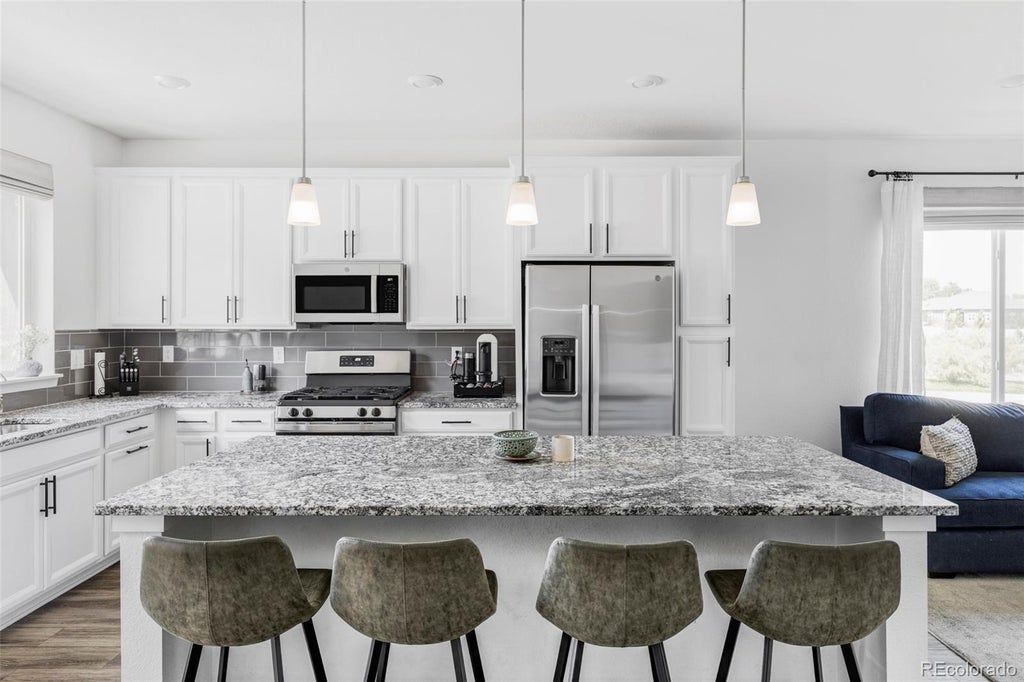 Enjoy a low-maintenance lifestyle in the heart of Lakewood in the new Green Gables community! This end-unit townhome offers privacy with views of green space to the north and gets great natural light. The thoughtfully designed open floor plan has high ceilings and a seamless flow between the living room + kitchen making the home great for hosting guests or quiet evenings at home. Complete with durable luxury vinyl flooring, a large kitchen island, granite countertops, and stainless steel appliances, the space is fully move-in ready with beautiful finishes. Upstairs, you'll find a huge primary suite featuring an oversized walk-in closet with custom closet systems and an ensuite bath with dual vanities and a walk-in shower. Two additional well-sized bedrooms, a dedicated laundry room, and plenty of storage closets round out the upper level. The big wraparound front patio offers a serene outdoor living space and a setting ideal for morning coffee or evening relaxation. Enjoy a beautifully landscaped community, walking trails, a private community pool, playground, and shared grassy areas—all maintained for you. Located just minutes from the Belmar shopping district, you’ll have quick access to shops, restaurants, and grocery stores. Outdoor enthusiasts will love being close to Ward Reservoir, Bear Creek Green Belt, and Lakewood Heritage Center. Easy access to 6th Ave makes commuting to Denver or the foothills a breeze. This place is the perfect opportunity to get a move-in ready home, low-maintenance living, and instant access to amenities to build an ideal Colorado lifestyle!