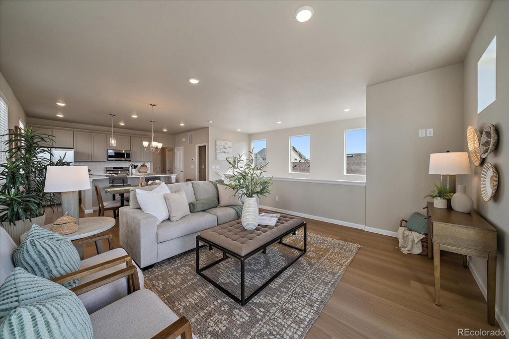 Welcome to your dream home! This 2024 built home comes with stunning mountain views and a bright open floorplan. Step inside to discover spacious living areas filled with natural light, perfect for entertaining or relaxing. This 3-bed, 3-bath home has everything you’re looking for and is move-in ready. Enjoy Colorado sunsets from the living room, kitchen, and large second-floor deck. Includes all kitchen appliances, washer, dryer, and window coverings. Features luxury vinyl plank flooring, carpeted bedrooms, quartz counters in kitchen and bath, and a private primary suite upstairs. An assumable 2.9% loan is also available to qualified buyers.