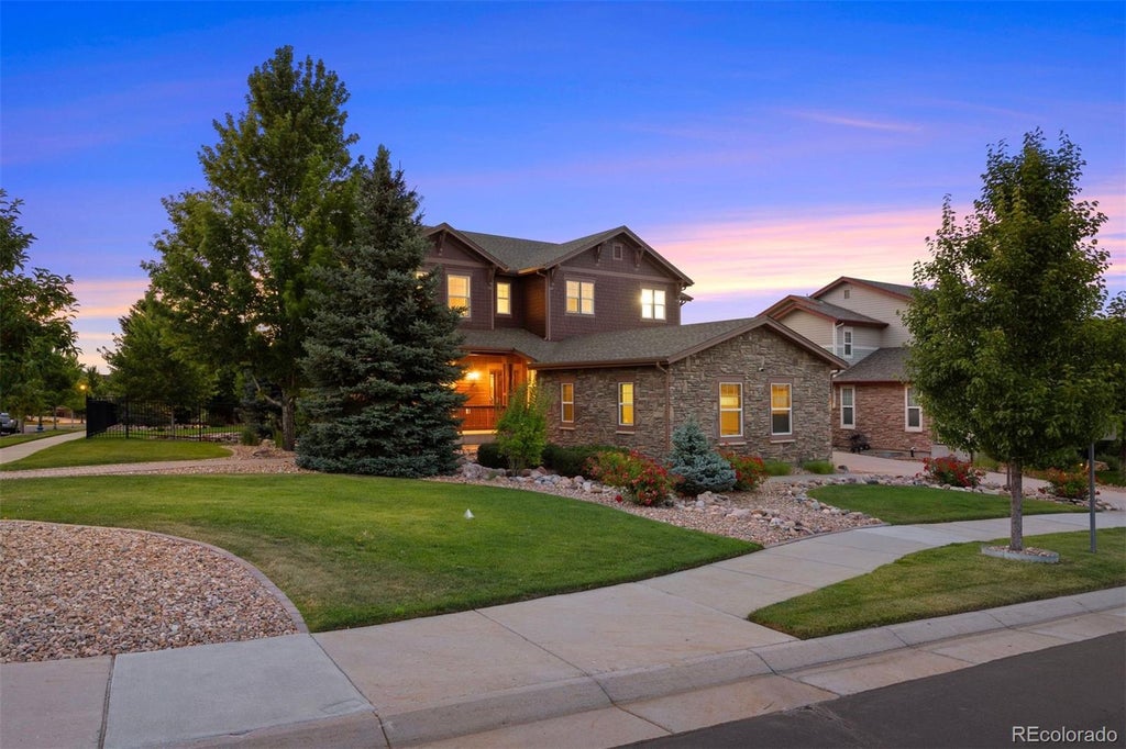 Price reduced $10,000 to $889,500! This elegant 2 story home in Blackstone Country Club is a tremendous value for this golf course community with abundant parks, trails, and amenities. The home is conveniently located on a corner lot in southeast Aurora with proximity to dining options at Southlands Mall; brand new Woodland Elementary a couple blocks away; and easy access to Denver International Airport. You will love meeting friends for dinner at the clubhouse as a social member by living in Blackstone. The pool, tennis courts, and private pickle ball courts are all included. The fitness center has been recently renovated and will save you from having to join a separate gym. Entering the home from the covered front porch you will notice the exceptional landscaping and walkways surrounding the property. The foyer is welcoming, and a charming living room is a great place to meet guests and chat by the fireplace. The great room is so expansive that you have plenty of space for a sectional couch and TV viewing. The gourmet kitchen with eat-in breakfast area has all the things you would want to prepare some epic meals, i.e double ovens, gas range, stainless appliances, granite counters, and tile backsplash. This kitchen area also flows nicely to the backyard patio with putting green and exceptional landscape lighting the trees. Upstairs you will find a glamorous primary suite with 3 extra bedrooms. In the finished basement you can play a game of pool in the rec room and settle in for movie night in the home theatre. There is also a wet bar and an additional bedroom & full bathroom in the basement. This home has so many extras including - main floor office, custom blinds and window coverings, wood flooring, oversized 3 car garage, 3 fireplaces, his/her walk-in closets, and more.