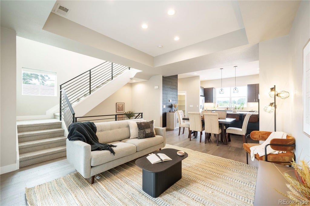 Tucked away literally next to the InterUrban Parkway Trail system connecting you to the Greater Denver Metropolitan area, this wide end unit townhome has expansive views of the mountains to the west, as well as to the north overlooking the park, community garden and the iconic Olde Town Arvada Water Tower. Welcome home to your perfectly situated 3 bed 4 bath home which sits a short bike ride to the best restaurants and entertainment as well as a quick commute to Denver, Lakewood or Golden. Or if you want to stay home and host, this place has it all, from a stone clad sunny patio off of the guest bedroom/office/gym, the covered deck off of the living room kitchen, or hang out and play games out of the oversized garage next to the park. All providing lots of space to entertain. If a chill day is what you are looking for, this place provides. The well appointed primary suite has all the space you would want for a relaxing experience with private balcony, walk in closet, en-suite bathroom and a laundry room. This modern and energy efficient property comes with elevated finishes with appliances from Frigidaire Gallery, bathroom fixtures from Kohler, Carrier HVAC and a Navien tankless water heater. If you travel a lot and want to make use of your property investment, this place allows short term and long term rentals giving you all the options as a homeowner and investor.