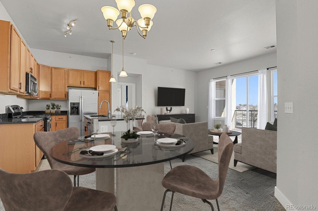 Light and Bright South Facing Unit with 10 feet Ceilings. Two Separate Bedroom Suites with Full Bathrooms. Living Room, Dining Room, and Kitchen in the Middle of the Suites. Kitchen has Maple Cabinets, Stainless Steel Appliances, and Granite Counters. Dining area is adjacent to the Living Room with Slider to the Balcony that Faces South with Tones of Natural Light. Great Storage Closet off the Balcony. Primary Suite is on the corner with no shared walls. Seller provides Black Out Curtain for Restful Sleeping. Walk-In Closet and Dual Sink Bathroom with Large Linen Closet. Secondary Bedroom has a Built-In Desk for the Work from home person situation. Full Size Washer and Dryer Closet with Shelving. Walking distance to Dining, shopping, grocery stores. Short drive to the Light Rail, 1-225, and the Aurora Mall. Secured building with access code. Professionally cleaned building with private entrances. Make this maintenance free move in home yours today!
