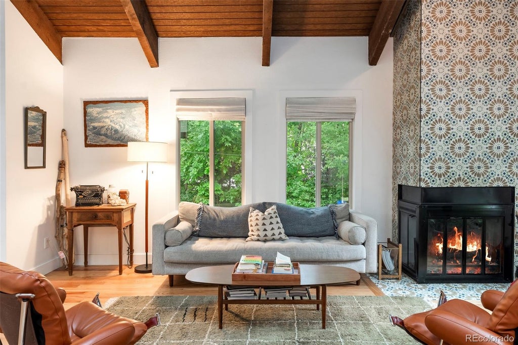 A rare fusion of modern design and timeless character is unveiled in this fully reimagined Applewood Green residence. Showcasing soaring ceilings, an open floorplan unfolds with abundant natural light. A stunning fiddle leaf fig tree anchors the entryway, setting the tone for the home’s unique character. The living and dining areas are enhanced by vaulted, wood-beamed ceilings and a striking wood-burning fireplace, while the open kitchen boasts premium finishes perfect for entertaining. Two primary suites — one on each level — offer ideal flexibility for multi-generational living. Upstairs, dual loft areas provide space for a home office or lounge. The lower level is designed for leisure with a movie theater room, wet bar, updated flex space and generous storage. Outside, mature trees and lush foliage create privacy around the expansive yard featuring a patio with a pergola and a raised deck with a sauna. An oversized two-car garage and large mudroom complete this renovated retreat.