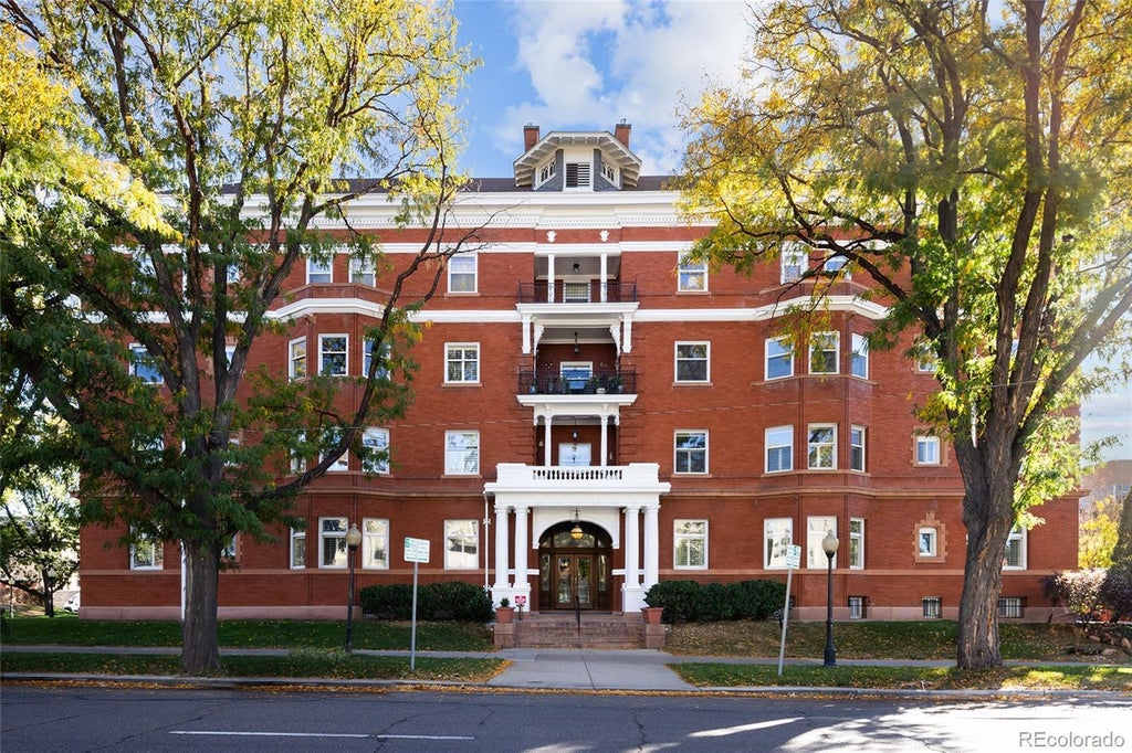 Uptown living at its finest in one of the most unique and beautiful buildings in Denver! An iconic piece of Denver history, the Perrenoud was built in 1901 by the 3 daughters of John Perrenoud. You will be stunned by the grand foyer with rotunda, Italian marble, plasterwork and lovely stained glass. Wait till you see Colorado’s only working birdcage passenger elevator! This home is elegant and full of light from the stunning windows. Notice the many original features throughout. This lovely home features 2 bedrooms and 2 baths with a bonus study/den that could be easily converted to a third bedroom. The primary bedroom features a beautiful balcony overlooking downtown Denver. The kitchen & baths have been updated. Mitsubishi mini-splits were recently added to the bedroom & the dining room. Don't miss the IN UNIT laundry room with a full size washer & dryer & a large sink. The quarter-sawn oak flooring is fabulous & the bedroom floors have recently been refinished. The unit has new elegant paint throughout. The original windows have had the cords lovingly restrung. And a new dishwasher was added. Delight in the door transoms, custom-milled baseboards & crown molding. Recent building improvements include a new boiler, roof & standpipe, & secured entry system. The entire building exterior has been repainted. Numerous building amenities include a gated courtyard garden, fitness facility (in the former ballroom), wine cellar, enclosed bike storage room, private storage rooms for each unit, & owner’s garage parking. Be sure to read the history of the building in the basement museum. HOA offers extraordinary value, including gas, heat, water, trash, composting, recycling, sewer, capital reserves, building & grounds maintenance, & snow