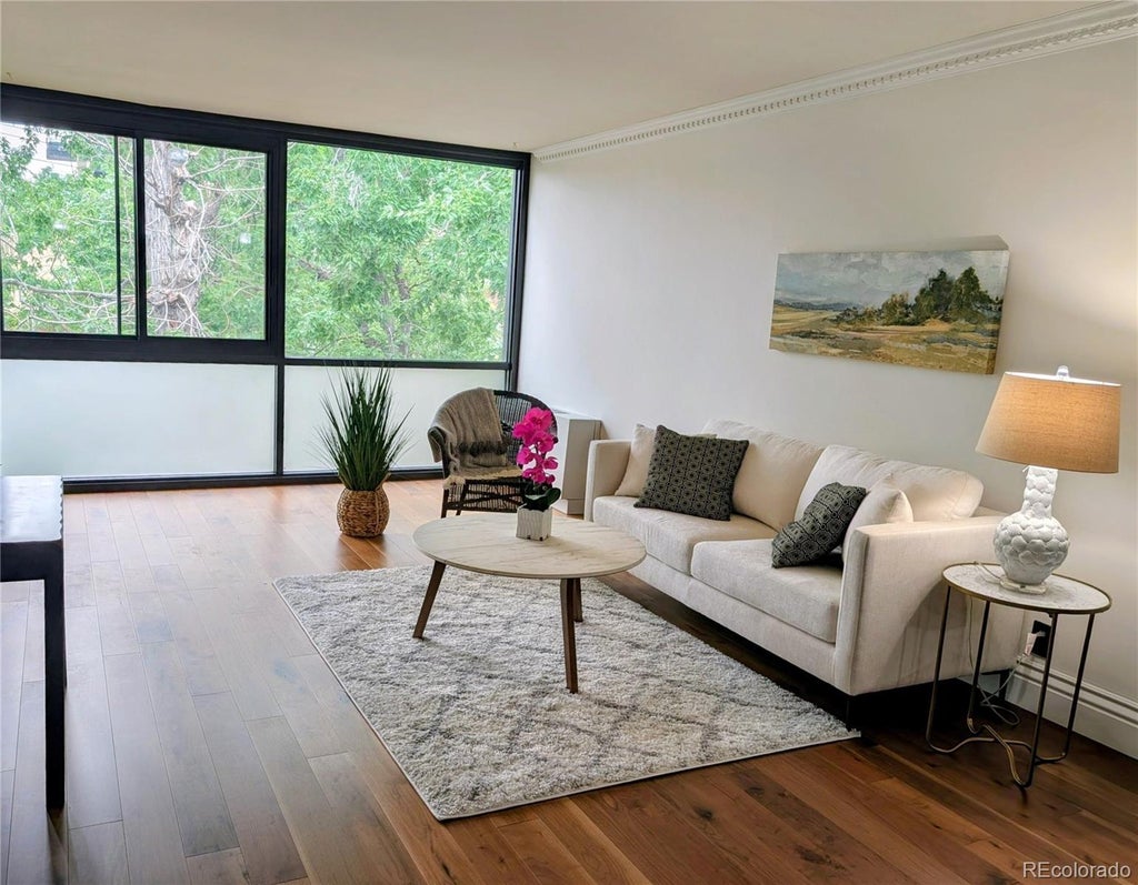 NEW PRICE! 3rd floor penthouse unit in the hub of the action in Capitol Hill*Eastern light floods in the back wall of newly replaced, black framed windows that open to mature trees*CENTRAL A/C instead of a window unit means common hallways are cooled*Features newly replaced WALNUT engineered hardwood floors sourced from MacDonald hardwoods*The hallway kitchen has been remodeled to an open kitchen peninsula with bar stool seating*Stainless steel appliances*Every inch has been maximized for storage & convenience—from spice racks to pull-outs in both cabinets & open shelving for display*Even a hidden storage cabinetry under the peninsula*The bar counter design caters to the entertainer chef, ideal for cooking a meal or sharing drinks together*Note the quality finishes—granite counters, crown moulding with dentil details, high baseboards, & upgraded tiles add elegance & class*A versatile sunroom off the bedroom & living room has had various uses over the years—an office, dining room, reading room, art room, or garden room*The bedroom is sized for a king bed with furniture in addition to a large closet*A full bath is remodeled with travertine tiles on the floor & tub surround*It also has a cozy heat lamp & hidden vanity storage*This condo includes a reserved off-street parking space along the back of the building*Deeded parking space #31 offers room for a larger vehicle*The unit includes storage closet #23 in the garage*1/0 LENDER PD BUYDOWN*Gr8 value for city living! New roof! HOA includes SECURED BUILDING, HEAT, WATER & SEWER, LAUNDRY ROOM WITH APP OPERATED MACHINES, BIKE ROOM, FITNESS CENTER, CLUB ROOM W/ KITCHEN & 1/2 BATH & SAUNA ROOM*Elevator access means no stairs! Incredible walk score*YOU CANNOT BEAT THE LOCATION! 1/2 block to Whole Foods or King Soopers*Easy walk to Starbucks, Ace Hardware, restaurants, bars, & coffee shops*Walk to Cheesman Park a few blocks away to enjoy a picnic or play outdoors*You don't even need a car! This is a lovely place to call home!