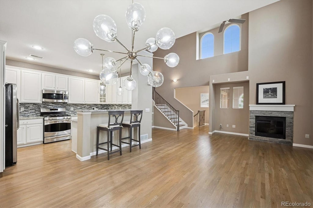Discover modern elegance in this stunning corner unit with no one above or below you, two-bedroom, two-bathroom condo nestled in the heart of desirable Highlands Ranch. This thoughtfully updated residence showcases premium craftsmanship with solid white oak hardwood flooring that flows seamlessly from the welcoming entry up the stairs, through the living, dining kitchen, and primary suite. The space feels both sophisticated and inviting, enhanced by wider custom baseboards and fresh paint throughout. The heart of the home features a chef-inspired kitchen boasting granite slab countertops, a striking new marble and slate backsplash, and top-tier stainless steel appliances including a convenient gas cooktop. The open loft-style living area captivates with soaring two-story ceilings that flood the space with natural light, creating an airy atmosphere perfect for both relaxation and entertaining. Comfort extends throughout with luxurious sixty-ounce Karastan carpeting in the guest bedroom and a beautifully appointed guest bathroom featuring a tub and shower combination adorned with custom ledger stone-look tile. The primary suite offers a spacious private retreat with upgraded carpet a large walk in closet, along with a beautifully appointed in-suite bath with double sinks, tub and separate shower with custom tile throughout. Located in the highly sought-after Tresana community, offering residents a club house, pool, spa/hot tub, play ground and beautiful landscape all maintained by the HOA. You can enjoy easy access to quality shopping at nearby Whole Foods Market, excellent educational opportunities at Valor Christian High School, and outdoor recreation at Cougar Run Park. The neighborhood perfectly balances suburban tranquility with urban convenience, offering reliable public transportation connections.