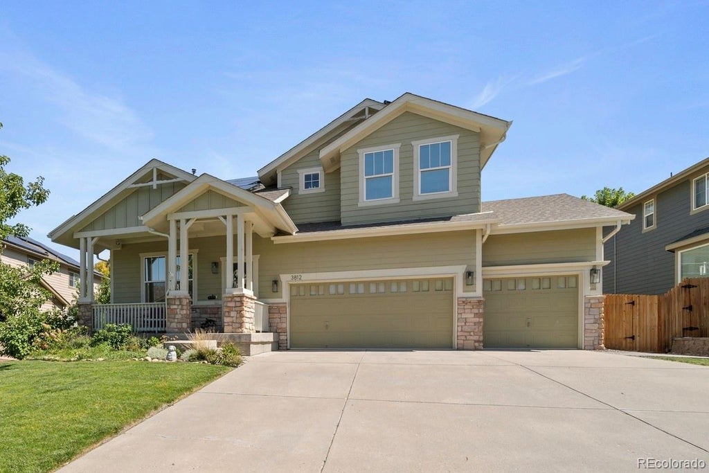Beautiful two-story home in Saddle Rock Highlands, located in the award-winning Cherry Creek School District. This spacious property offers over 3,600 square feet with 5 bedrooms, 3 full bathrooms, and a 3-car garage. The open floor plan features vaulted ceilings, beautiful LVP flooring, ceiling fans, gas fireplace, formal living/dining room and a separate family room. The updated kitchen includes quartz counters, a large center island, stainless steel appliances, gas cooktop, and plenty of cabinet space, flowing into the family room with a cozy gas fireplace. The primary suite has a five-piece bath and walk-in closet, while a main-level bedroom and full bath provide excellent guest or office space. Solar panels are already installed, providing the benefit of low or even no monthly electric bills.