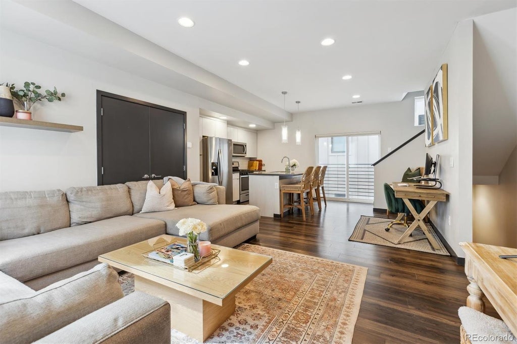Live in the heart of West Colfax in this urban contemporary walkup townhome, steps from Sloan's Lake, premier shopping, dining, and entertainment, this is 1287 Quitman Street. Inside, sleek architectural lines come together with an inviting and modern open floor plan. The upgraded kitchen features flat-front cabinetry, an oversized center island, a stainless steel appliance package, and a modern stacked backsplash tile. The upper level offers the private living quarters comprised of two spacious bedrooms, both featuring ensuite bathrooms, huge oversized windows, and a Juliette balcony. The true show stopper is the spacious rooftop patio, offering stunning mountain views and ample room for entertaining. The rooftop comprises a front-row seat to the pulse of the city, which is just steps outside your door, including the Perry Street Light Rail Station, Edgewater Public Market, Dry Gulch Park, and Sloan’s Lake. Additional features of this turn-key property include a main floor home office, playroom or home gym, upgraded laminate hardwood floors, curated finishes, and an attached 1-car garage. A rare opportunity to own a sophisticated, low-maintenance residence in one of Denver's most sought-after neighborhoods, book your showing today!
