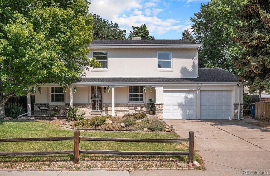 Stunning home that features 5 bedrooms, 3 bathrooms, and a spacious lot! As you walk in the front door you are greeted by a large living room with tons of natural light, plus new paint and flooring throughout the main level. The kitchen is a chef's dream with tons of storage and easy access to the back patio for BBQ's. It is also open to the living room with a wood burning fireplace! Upstairs there are 4 bedrooms, including a large primary suite with a private bath, and a full hall bathroom. The finished basement expands your living options with a versatile rec room, bedroom, and office. Outside, enjoy the covered front porch and a covered back patio overlooking the landscaped, fenced yard with mature trees for privacy and shade. Recent upgrades including new stucco, flooring, paint, and carpet. Conveniently located near schools, parks, shopping, dining, and easy access to I-225, this home is move-in ready and full of potential.