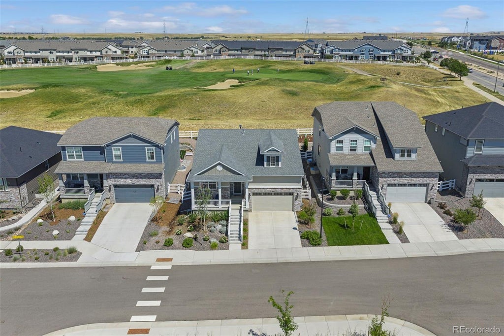 Enjoy one-level living with both mountain and golf course views in Murphy Creek! This 4 bedroom, 3 bath ranch with finished basement shows just like a brand new home! This home features all the design upgrades that other new builds no longer offer. Just off the front entryway, the home offers a bright living space perfect for a private home office and features stunning mountain views of the Front Range. Luxury vinyl plank flooring leads into the open and bright main living space that includes a large kitchen with quartz countertops and gorgeous herringbone tile backsplash with center island. A large walk-in pantry facilitates additional storage options paired with white cabinetry and almost new stainless steel appliances. A dedicated dining space helps distinguish the kitchen from the large living room featuring a gas log fireplace and oversized sliding glass door that opens to a rare covered patio and private, xeriscaped backyard on the first hole of the Murphy Creek Golf Course. An oversized Primary Bedroom with walk-in closet, ensuite bath w/dual sinks featuring quartz countertops and tile flooring with mud set tile shower complete the Primary Suite. Two more secondary bedrooms share access to an additional full bath with a tub/shower combination. Also located conveniently on the main floor is the laundry room with a like-new washer and dryer included! The large finished basement adds significant finished space to this home with a large bonus room perfect for entertaining as well as quiet movie nights complete with a guest bedroom and additional private bathroom and plenty of room for storage. Murphy Creek offers an impressive array of resident amenities including a clubhouse with restaurant - weekend brunch anyone? As well as the resident pool, tennis courts, parks, trails and of course the golf course of which memberships are sold separately.