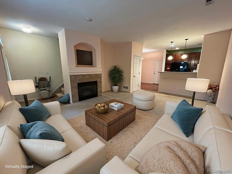 UPDATE: NEW PRICE ADJUSTMENT & WILL BE PAINTED IN NEUTRAL COLOR VERY SOON!! This move-in ready, beautifully maintained home, in lovely Highlands at Westbury has 2 primary suites & 3 baths. The spacious living room can accommodate gatherings or to have a cozy evening by the fireplace. The high ceilings and large, newer windows provide an airy, sunny and open feel. The kitchen and dining room are adjacent so conversations flow easily. The kitchen has beautiful 42” Merillat cabinets, new fridge, flat top stove, pull out bins in pantry, recessed lights, a raised bar and adjoins the dining room. All appliances are included. The powder room is larger than most and discreetly located off the dining room. The wood floors in these areas are beautiful and add a warm touch! The attached 2 car garage is both a convenient and a secure way to enter your new home. Upstairs you enter the expansive primary suite through French doors and an archway. Picture yourself relaxing in the bonus area by the fireplace, TV niche and wall to wall bookcases. A vaulted ceiling and large, newer windows to allow in an abundance of light. The amazing adjoining 5 pc. bath has a step in shower, linen closet & walk in closet. The second spacious primary bedroom has a full bathroom, Southern sun and a walk in closet. Laundry w/ full size W/D and is conveniently located upstairs between the bedrooms. Enjoy the quiet atmosphere of this area on your covered, private front porch. Other features: newer A/C & furnace (w/warranty), water heater, new insulated garage door, cellular shades on all windows and professionally cleaned. Would you like to own a townhouse (no one above you!) but the stairs are a deterrent? Solution: this beautiful townhouse has a Acorn stair lift to carry you easily up & down the stairs! (lift is removable) Amenities: clubhouse, pool & spa, tennis & basketball courts, playground, pergola & gazebo. Centrally located near restaurants, shopping and access to main highways. Don't wait!