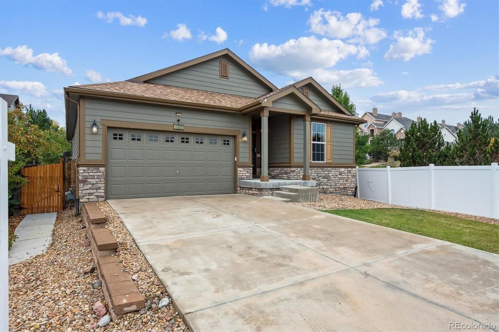 Welcome to this beautifully maintained ranch-style home in the desirable Iliff Commons neighborhood of Aurora — ideally located near Buckley AFB and just minutes from Tower Road for convenient access to shopping, dining, and major routes. Step inside to discover high ceilings and hardwood flooring flowing throughout the main living areas. The living room is filled with natural light and features a cozy fireplace with a mantel, creating a warm and inviting atmosphere. The kitchen is a true highlight with a gas stove, recessed lighting, an eat-in island, a pantry, and updated light fixtures, offering both style and functionality for the home chef. The primary bedroom serves as a private retreat with soft carpet flooring, a standing glass shower, dual-sink vanity, linen closet, and a walk-in closet. The secondary bedrooms also feature cozy carpet and plenty of natural light, ideal for guests, family, or a home office. The unfinished basement with 9-foot ceilings provides endless potential for future expansion — perfect for a gym, rec room, or additional living space. Outside, enjoy a professionally landscaped, fully fenced backyard featuring low-maintenance turf and a pergola, perfect for outdoor entertaining and relaxation. Additional highlights include paid-off solar panels for energy efficiency, a newer roof for peace of mind, and updated fixtures throughout. Home inclusions feature the washer and dryer, security cameras, and a front doorbell camera for added convenience and safety. This home perfectly combines comfort, charm, and modern living in a prime Iliff Commons location close to parks, trails, and key commuter routes.