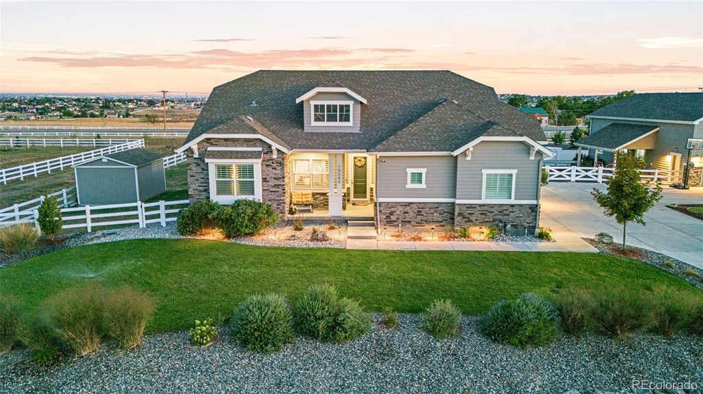 Welcome Home!!! Looking for an In-law-suite? Beautiful Turn key home in Promontory Todd Creek w/ fully finished basement featuring a separate kitchen. Upon entering you’re greeted by a large formal living/dining room. Continue to the open floor plan kitchen & living room you will find the living room has tons of windows affording courtesy of natural light throughout as well as a fire place for these cool Colorado evenings. The kitchen features stainless steel kitchen aide appliances, bib sink ,large pantry, granite counters, space for a kitchen table & large island w/ bar seating. The secluded oversized master bedroom has another fireplace making it a cozy retreat. The private master bathroom has dual vanities & dual closets & a soaker tub. Also on the upper level are 2 more bedrooms, 2 more bathrooms & Laundry. The fully finished basement is perfect for entertaining or multi-generational living as it houses 2 more bedrooms, full bathroom & separate kitchen. Other features of this home are:LVP floors, granite in all bathrooms, glass shower doors, electric fence, 240amp, 220amp, ceiling fans, plantation shutters, security door, vivint alarm with cameras, & ring camera, The 4 car garage equipped with a 240 electric car charging station completes this modern home. Situated on a spacious 1-acre lot, you have plenty areas to entertain guest. The immediate patio has a fireplace, TV hookup & gazebo on a custom stamped concrete patio. There is also a wood fire pit. Need space for hobbies, toys or storage?The impressive dry walled 1,200 sq.ft. outbuilding is ideal for a workshop as it has electricity, RV with a 220 plug, &/or extra vehicles or storage.The out building also has another covered patio with a ceiling fan. This home blends comfort, functionality, & versatility in a peaceful,country-style setting. Nested in a family friendly neighborhood with block parties & neighborhood garage sales all while being mins from hwy 85/I-25. 10 minutes to riverdale & Todd creek golf.