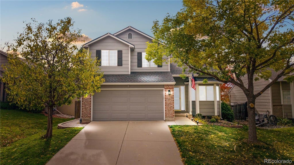 Welcome to this beautifully updated two-story home in the desirable Saddle Rock Ridge community. Bright and open with vaulted ceilings and modern finishes, this home offers the perfect blend of comfort and functionality. The main level features LVP flooring throughout, creating a seamless flow from the spacious living area into the inviting family room, where a cozy fireplace adds warmth and charm. The dining area connects the family room and kitchen, with sliding doors leading out to the private backyard and patio—ideal for entertaining or relaxing outdoors. The kitchen is designed for both everyday living and hosting, featuring sleek quartz countertops, stainless steel appliances, and a generous island for meal prep or casual dining. A convenient powder room and laundry room complete the main floor. Upstairs, the primary suite offers a bright and spacious layout with an en suite five-piece bathroom that includes a soaking tub, separate shower, dual sinks, and quartz countertops. A large walk-in closet provides ample storage and completes the space. Three additional bedrooms and another full bathroom provide plenty of space for family, guests, or a home office. The unfinished basement is ready for your personal touch—whether you envision a gym, rec room, or additional storage. The private backyard features a spacious deck, perfect for outdoor dining or weekend gatherings. Surrounded by mature landscaping, it offers a comfortable space to relax and unwind. Conveniently located near parks, trails, shopping, and dining—with access to top-rated Cherry Creek schools—this home combines modern comfort with an ideal neighborhood setting.