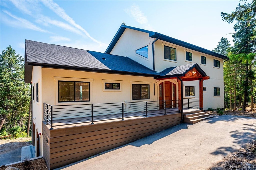 Located in the scenic foothills of Evergreen, Colorado, 25553 Mountain Moss Court is a new-construction, two-story single-family residence. Situated on a private 3.81-acre lot, the home offers amazing views and a spacious floor plan. Total square footage is 4,170 total square feet, with 2,998 finished square feet above grade and a 1,172-square-foot finished, walk-out basement. The layout features a 4-bedroom, 5-bathroom home with one bedroom on the main level and three on the upper level. The five bathrooms consist of two full baths, two three-quarter baths, and one half-bath. There are 2 gourmet kitchens in the home to allow for entertaining large groups. The exterior features a stucco finish, a deck, and a balcony that allows you to see for miles.
