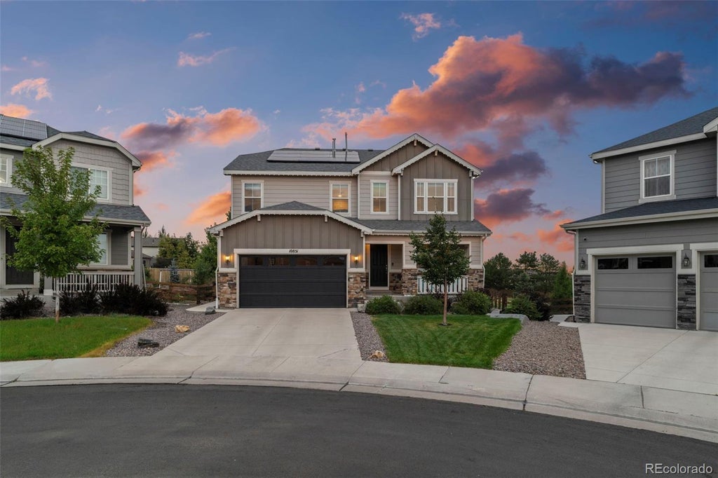 Price Improvement! Now Offered at $799,900! Meticulously maintained and highly sought-after Richmond Hemingway model with high-end finishes, seller-owned solar panels, and an unbeatable location just minutes from the Cherry Creek Trail! This stunning 5-bedroom, 4-bathroom home offers 4,112 total square feet, including a fully finished basement designed for both function and fun. The main floor greets you with a spacious foyer, gleaming hardwood floors, wrought iron railings, recessed can lighting throughout, and custom up/down blinds. The dedicated main floor study with glass French doors is perfect for remote work. The gourmet kitchen will impress any home chef—featuring a massive 10’ center island with seating for four, custom pendant lighting, 42” mocha alder cabinets, GE Profile black stainless appliances, convection double ovens, 5-burner gas cooktop, walk-in pantry, and a bright open dining area ideal for entertaining. The inviting family room centers around a modern gas fireplace with alder mantle and tile surround. Upstairs, retreat to a luxurious primary suite with tray ceilings, a spa-like 4-piece bath with dual vanities and pebble-floored shower, plus a huge walk-in closet with custom built-ins. An oversized loft offers versatile space for a second family room, media zone, or play area, along with three additional bedrooms, full bath, and laundry room. The finished basement boasts 9’ ceilings, a large rec room with built-ins and wet bar rough-in, guest bedroom, ¾ bath, and ample storage. Outside, unwind under the covered Colorado Room with built-in gas grill, surrounded by lush landscaping, mature trees, shrubs, and Jellyfish lighting. The oversized 2-car garage includes epoxy floors, high ceilings, suspended storage, and a motorized bike pulley system. Just minutes from American Academy Charter School—consistently ranked as one of the top schools in Colorado—plus shopping, restaurants, Downtown Parker, E-470, and more. Only 15 mins to DTC and 25 to DIA!