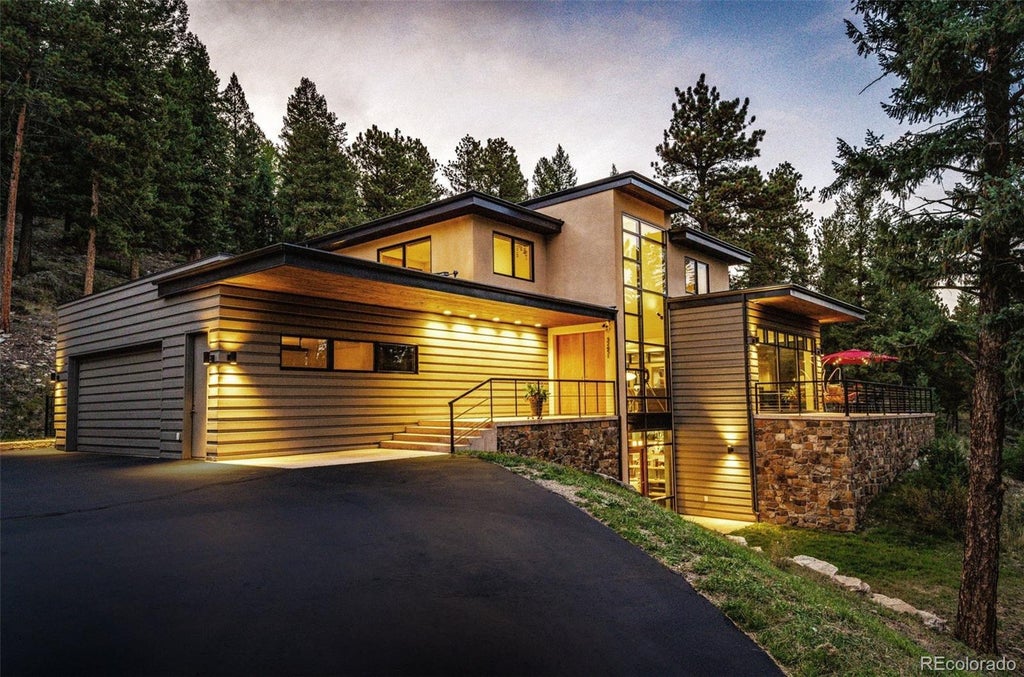 Coming soon April 26. Welcome to this exquisite four-bedroom, four-bathroom custom home built on 5.6 private acres. It was inspired by Frank Lloyd Wright's mid-century modern prairie homes. You will not find a more well-appointed home in the area. With the massive, specially constructed metal windows, natural light fills this home at the correct times throughout the day/year. Connected to the kitchen is a patio with a stone-enclosed Sedona outdoor natural gas grill. It is a large, stunning chef's kitchen with many cabinets and storage space. The kitchen appliances are Décor, dishwasher (Bosch), and microwave (Sharp). There is a gas 5-burner down-vented range on the huge 34 sq ft quartz island. Stainless finishes were used wherever possible throughout the home. On the main floor, you will find a large primary bedroom and a spacious walk-in closet. The master shower offers a rain head along with a flexible wand. Undermount sinks are Duravit. Enjoy the double slider doors that lead to a massive private patio with an outdoor double-sided fireplace, hot tub, and dining. Door hardware is made by Emtek. Lighting throughout the home is custom-designed for impeccable ambiance. The radiant-heated main floor hardwoods are Brazilian cherry. The stairs, exterior doors, and trim are all American cherry with a natural finish. Beautiful, custom steel railings throughout. Upstairs, you will find three large bedrooms with access to a full bathroom and plenty of walk-in closet space. Ceilings are a minimum of 9', and drywall is level 4 smooth finish throughout. The walkout basement is fully finished with a stone surround fireplace, large TV mount, gaming area, half bathroom, wet bar with custom countertops, and individual wine and beverage coolers. You will be delighted to have a second heated 2-car garage with a heated 560 sq ft office/gym/studio space above. Less than a mile from Three Sisters Open space, with over 1000 acres of hiking/biking trails. Beautiful Contemporary Home