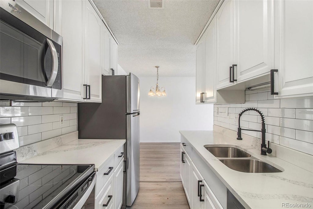 Welcome to this lovely top-floor condo located right in the heart of Denver. With 2 bedrooms ,1 bathroom and a large balcony,this home has been completely remodeled giving you a great mix of style and convenience. The entire space boasts laminate flooring adding a touch of elegance and easy maintenance. The kitchen is totally updated with quartz counters, new Stainless Steel appliances and modern cabinetry. Enjoy the added convenience of big walk-in closet, providing plenty of storage. Sunlight fills the living area through large windows, creating bright and inviting space. The bathroom got a stylish makeover with modern touches, giving it a relaxing spa-like vibe. Living here means having access to various amenities like a gym, clubhouse, tennis court and a pool – great for enjoying the Colorado lifestyle.There's a dedicated covered parking spot, conveniently located on the side of the building. Easy access to major highways I-225 and I-25. Additionally, the community's proximity to restaurants, parks, coffee shops and the Denver Tech Center (DTC) adds to the ease and enjoyment of daily living. Don’t miss out on this beautifully remodeled home.