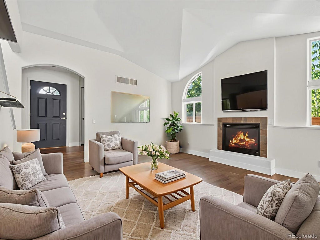 Step inside to an open-concept main floor where the living, dining, and kitchen areas flow seamlessly together. Soaring vaulted ceilings create a bright, inviting atmosphere, while a cozy gas fireplace adds warmth and character. The kitchen is equipped with newer stainless steel appliances, including a gas range, and connects to the dining space for easy entertaining. Enjoy newer engineered hardwood floors throughout the main level, complemented by fresh carpet upstairs.