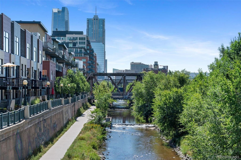 Outstanding penthouse with 2 garage parking spaces!!? This 2 Bedroom 2 Bath 4th floor Penthouse with 14ft ceilings features spectacular riverfront and mountain views! You will enjoy the wrap around terrace that overlooks Cherry Creek and its bike path on those beautiful sunny Colorado days! Oversized windows in this home make the beautiful interior shine. The newly refinished maple hardwood floors are warm and bright. Stunning kitchen complete with expansive solid surface granite countertops top of the line appliances and maple cabinetry. Custom remodeled primary bathroom with oversized tiled shower. Additional features include Hunter Douglas Window shutters, Two secured underground parking spaces (Spaces 55 and 56) which sit directly across from elevator, a very convenient 4th floor Storage unit and garbage chute. This is a One-of-a-kind property in a very desirable Downtown location. Walking distance to Riverfront Park, Elitch Gardens, Confluence Park, Cherry Creek Trail and Pedestrian Bridge to LoHi. Short walk to Union Station and fabulous Downtown restaurants. New Hot water heater, washer dryer included