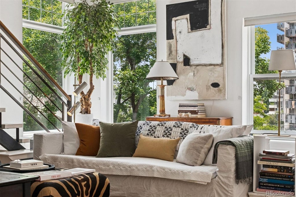 Live Above It All in Capitol Hill – A Rare Two-Level Corner Loft featured in "Colorado Home & Lifestyles Magazine" in 2020! Welcome to your new urban sanctuary in the heart of Capitol Hill! This top-floor, two-story corner loft combines modern design with everyday comfort. Soaring 17-foot ceilings and windows on all four sides fill the home with natural light and offer peaceful tree-top views that create a true sense of escape—right in the middle of the city. The dramatic staircase anchors the open-concept layout, where entertaining and everyday living flow effortlessly. Two spacious bedrooms and two baths provide the flexibility and privacy today's buyers need, whether you're working from home, hosting guests, or simply relaxing in style. Enjoy peace of mind knowing the building is well maintained, with recent updates including a new elevator motor (2024), a new roof (2021), and resurfaced catwalks (2020). The heated, secure garage offers two side-by-side parking spaces—no more shuffling cars—and a large private storage room for all your gear. Retreat to the primary suite, complete with a private balcony and peek-a-boo mountain views. This home lives like a single-family residence with the benefits of lock-and-leave condo living. The location truly checks every box: walking distance to four grocery stores, countless restaurants and coffee shops, and a quick hop to downtown, Cherry Creek North, I-25, or 6th Avenue for weekend mountain getaways. If you've been searching for the perfect blend of city convenience and elevated living—this is it. Are you ready to make this one-of-a-kind loft your home? All furnishings are available for purchase.