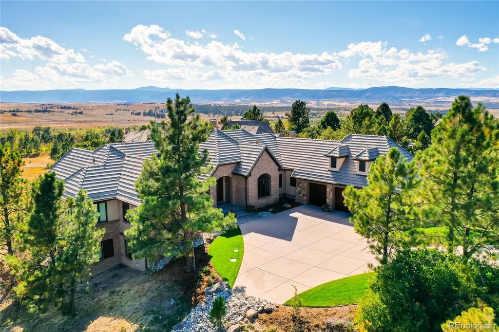 Breathtaking Custom Home with Mountain Views in Castle Pines Village. This extraordinary home, set against the backdrop of open space and majestic mountain views, was fully reimagined in a stunning remodel—every detail thoughtfully curated for luxury living and effortless entertaining. As you arrive via a private, secluded drive, the impeccable landscaping and richly updated exterior—featuring stone accents and wood carriage-style garage doors—set the tone for what’s to come. Step through the front door and be greeted by a dramatic barrel ceiling entryway framing a picture-perfect view of Pikes Peak. Inside. Elegant finishes and artisan craftsmanship define every room. From hand-troweled walls to 8’ knotty alder doors, wide-plank hardwood floors, custom wainscoting and four striking Astria fireplaces, this home is an architectural showcase. The formal living room stuns with rich wood beams and expansive views. The gourmet kitchen is a dream for any home chef, equipped with top-of-the-line Wolf and Sub-Zero appliances. Nearby, the formal dining room impresses with wood-beamed ceilings. Retreat to the luxurious primary suite, where vaulted ceilings, a cozy fireplace, and mountain views create a true sanctuary. The spa-like bath features a wood-accented coffered ceiling, exquisite finishes, and an oversized custom closet complete with a bay window and frosted glass. Downstairs, the fully redesigned walk-out lower level is built for fun—featuring a full-size great room, expansive custom bar with dual wine fridges, and even a golf simulator space. Not a golfer? Convert this area into a game room, home theater, or billiards lounge! High ceilings, full-size windows, and 8’ sliding glass doors flood the lower level with natural light. Each of the 4 lower-level bedrooms includes its own beautifully remodeled en suite bath, with one tucked away as an ideal guest or nanny suite. The covered lower deck, complete with a built-in TV is perfect for year-round enjoyment.