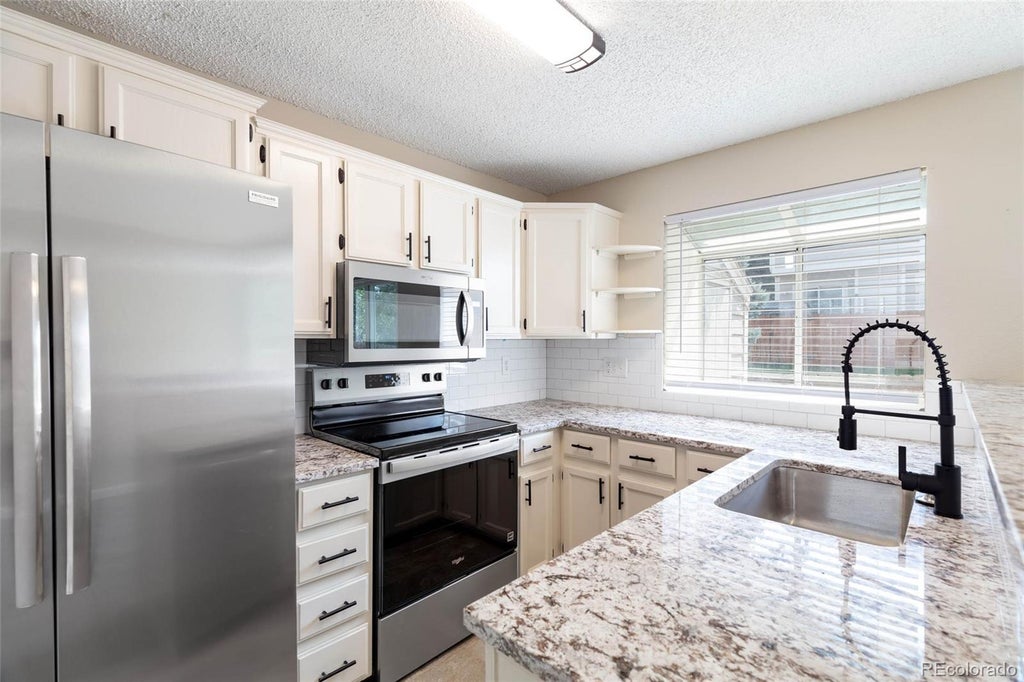 Stylishly updated townhouse near Buckley Air Force Base! Located just steps from the community pool, this beautiful two-bedroom home offers modern updates and low-maintenance living in a prime location. Recent upgrades—completed by a licensed contractor—include fresh interior paint, new flooring throughout, newly painted cabinetry, granite countertops, subway tile backsplash and bath/shower surround, updated lighting fixtures and an upgraded HVAC system board. Upon entry, the open floorpan is warm and inviting with effortless flow. The living room is highlighted by a cozy, wood-burning fireplace with a new mantle and conveniently-placed outlet for above-mantle TV mount, new dimmable recessed lighting and attractive new laminate flooring. The kitchen is flooded with natural sunlight and includes new stainless steel appliances, sleek granite countertops, modern subway tile backsplash, a breakfast bar, large pantry and adjoining dining room with access to the private yard and patio. On the upper level find two generously sized bedrooms—the primary with an ensuite bathroom and a secondary bedroom steps to the hallway bathroom. Both bedrooms are complete with vaulted ceilings, new ceiling fans/lights, new carpet and spacious closets. The private backyard offers direct access to the meticulously maintained greenbelt—perfect for entertaining! Enjoy low-maintenance living in a quiet community conveniently located close to Buckley Airforce Base, DIA, parks, restaurants and shopping. Quick access to E-470 for an easy commute to the mountains and all the surrounding amenities. Rest easy with a seller-paid one-year home warranty.