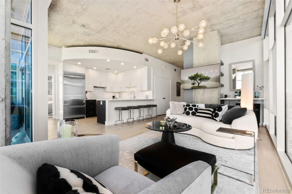 Experience elevated urban living at it's finest in this completely renovated 2-bedroom, 2-bathroom residence at the iconic Glass House. Perched on the 10th floor, Unit 1014 is a rare blend of luxury and style, featuring top-tier designer finishes throughout. From the moment you step inside, you're welcomed by gorgeous wide plank engineered white oak flooring that sets the tone for the refined aesthetic. The custom kitchen is a chef’s dream, boasting custom Tharp cabinetry, marble countertops, a Wolf oven with induction cooktop, a sleek Zephyr vent hood, and a new full-size refrigerator. The built-in bar area with a dual-zone beverage fridge makes entertaining seamless and sophisticated. Every detail has been carefully curated—from the custom lighting and fixtures to electric Hunter Douglas blinds, solid wood doors, and high-end finishes sourced from Restoration Hardware and the Design Center. The primary suite is a serene sanctuary, showcasing stunning views and equipped with electric blackout shades to ensure restful sleep. The spa-inspired en-suite bathroom features a dual-sink Restoration Hardware vanity, an oversized rain shower, a full-length marble-framed mirror, and a generous walk-in closet. The second bedroom and bath mirror the same level of thoughtful design—ideal for guests or a sophisticated home office. Enjoy all the premier amenities The Glass House has to offer, including a 24-hour concierge, fitness center, pool, and rooftop lounge—all just steps from Riverfront Park, Union Station, and downtown Denver’s best dining and entertainment. This is a rare opportunity to own a truly bespoke condo in one of Denver’s most desirable buildings. ***Preferred lender offering 2-1 rate buy down***