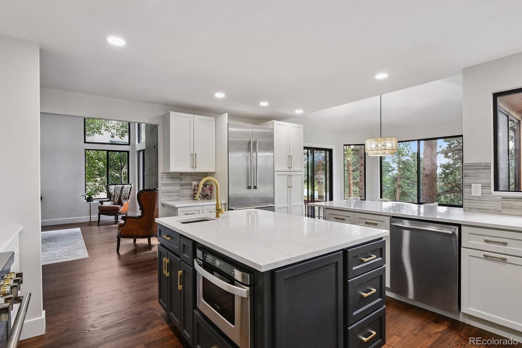 Discover mountain living at its finest in The Ridge at Hiwan, one of Evergreen's most coveted communities with amazing Mountain and Meadow Views! This stunning 5-bedroom, 5-bathroom home seamlessly blends modern sophistication with mountain charm, having been freshly updated throughout to showcase contemporary elegance. This is not your typical remodel. The home's quality construction shines through every detail. Step inside to find exquisite hardwood flooring spanning the main level – a rare treasure in today's market that adds warmth and character to every room. The great room commands attention with its floor-to-ceiling fireplace, while tons of windows bathe the space in natural light. A sweeping staircase creates dramatic flair, leading to the primary suite retreat where relaxation takes center stage. You will also find a secondary ensuite and two additional bedrooms and a full bathroom to share. The versatile lower-level study can easily function as an additional bedroom. Whether you're working from home or hosting guests, this flexible space adapts to your needs. Outside, the property comes with a fenced yard – a grandfathered feature that's rare in The Ridge! The outdoor area features flagstone patios and redwood decking! Whether inside or outside , both become your personal sanctuary for entertaining or simply soaking in Colorado's stunning scenery including views of Bergen Peak! This exceptional property places you minutes from hiking trails with Evergreen Lake nearby for year-round recreation.The convenience of shopping and restaurants keeps mountain living practical, while the Evergreen Park and Recreation District adds community amenities just minutes away. Remodeled right down to the windows and screens! This isn't just a house – it's your gateway to the Colorado lifestyle you've been dreaming about.