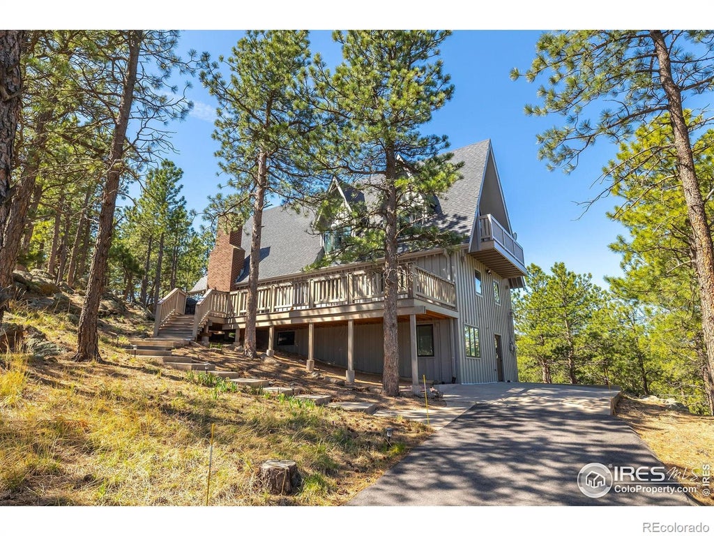 Discover your ideal escape at 65 Bristlecone Way, an updated home nestled in the sought-after Pine Brook Hills community. Minutes from Downtown Boulder, this impeccably maintained home will delight you daily. Set on a corner lot, it offers gentle slopes, Colorado native wildflowers, stunning rock outcroppings, and a large deck perfect for entertaining. Key features include main level bedrooms/office, quality construction, modern touches with smooth level 4 drywall, recent paint inside & out, recessed LED lighting, Marvin double-pane windows/doors, designer bathrooms, refurbished composite deck, hardwood maple floors and a flexible floor plan.The main level boasts a bright kitchen with superb appliances, including a 36" Verona 5 burner range, a living space that then opens to a backyard with porch swing to take in the surrounding nature and a hot tub for relaxation. Three bedrooms/offices on this level provide flexibility. Upstairs, the primary suite is serene with a tongue & groove ceiling, French doors to a private balcony, a renovated luxury bathroom with double vanity, oversized spa shower & marble details. The adjoining office lounge will draw you in with its floor to vaulted ceiling windows, wood-burning fireplace, retro bar, and balcony to admire stunning 360 degree views from the Continental Divide to Boulder Reservoir & the twinkling City of Boulder below.The lower level is spacious and efficient with a daylit multi-purpose rec room, spacious mudroom entrance, laundry, sauna, bathroom, great storage & guest bedroom. A detached generously oversized 2-car garage with a new roof, Hardie Board siding, and fresh paint offers covered parking/versatile project space. With ample room and exceptional features, 65 Bristlecone Way epitomizes Colorado living. Pine Brook Hills has own water source, ongoing forest mitigation, Boulder Mtn Fire dept, fire hydrants and a friendly community that looks out for one another. You have found your personal retreat here.