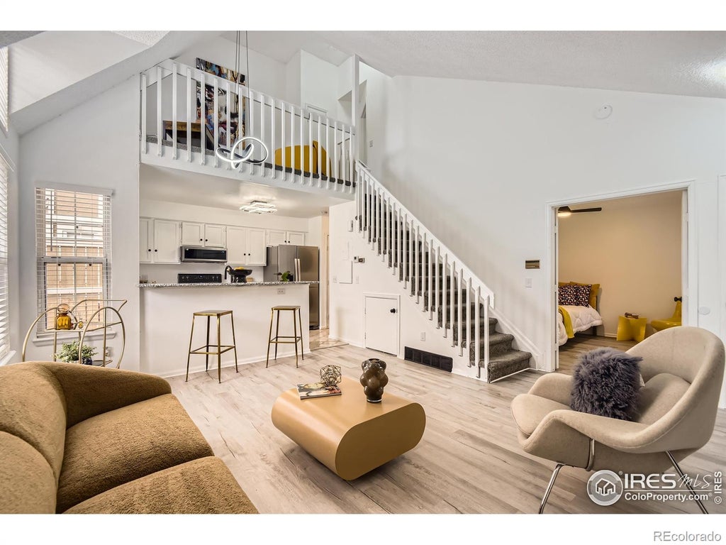 This townhome qualifies for Key Community's Fannie Mae HomeReady loan, allowing a 3% down payment (Conventional Loan). Contact for details. Class and contemporary touches flourish throughout this updated 2 BR x 2 BA end-unit townhome in the desirable Le Chateau community, where modern upgrades meet thoughtful design. This two-story home has been remodeled from top to bottom, offering a fresh, stylish, and turnkey living experience. Step inside to an impressive interior accentuated by soaring vaulted ceilings, a striking brick-surround wood-burning fireplace, and abundant natural light streaming in through extra-unit windows. The open-concept floor plan showcases brand-new luxury vinyl plank floors throughout the main level (and upper bath), paired with fresh new carpet on the stairs and 2nd level; bringing warmth and refined style to the home. The kitchen boasts brand-new granite countertops, chic pendant lighting, and stainless steel appliances- all seamlessly connected to the living and dining areas, which makes entertaining a breeze. The main floor features a spacious bedroom with wide French doors, LVP floors, and easy access to a dual-entry bathroom. The main-level laundry, thoughtfully tucked away, includes a newer washer & dryer for added convenience. Upstairs, a flexible loft area offers endless possibilities-use it as an office or media room. The upper-level primary suite is a true retreat, complete with a revitalized en-suite bathroom featuring new his-and-hers sinks, a new light fixture, and LVP flooring. Enjoy your morning coffee on the private patio, and take advantage of the community amenities, including a pool steps away. Fresh interior paint, modern light fixtures, and new bedroom ceiling fans. Extra storage in the crawl space. A 10-minute walk to the Light Rail. Quick access to I-225. Unbeatable convenience! Dining, shopping, and everyday essentials are all nearby.