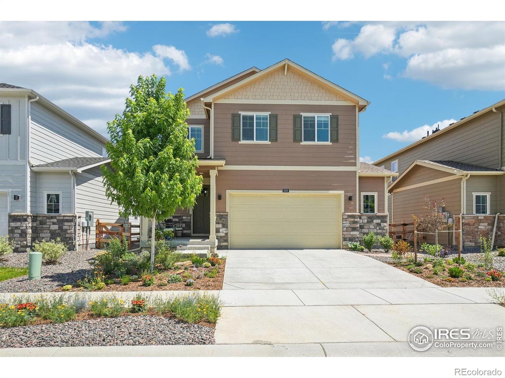 Welcome to this charming and well-maintained home in the desirable Hansen Farm community, where colorful xeriscape landscaping with perennial wildflowers creates beautiful curb appeal and low-maintenance outdoor living-front and back! A welcoming front porch with a seating area leads you into the entryway, where you'll find a convenient half bath, coat closet, and mudroom at the front of the hall. The hallway opens up into a bright and airy open-concept living space, featuring a spacious living room, kitchen with stainless steel appliances, pantry, and island with seating, and a dining area with sliding glass doors that lead to the sunny back patio-perfect for seamless indoor-outdoor entertaining. Upstairs, a versatile loft space offers endless possibilities for a home office, play area, or second living room. The primary bedroom suite includes a private bath with dual sinks and a walk-in closet, while two additional bedrooms, a full bath, and a laundry room provide practical comfort for everyday living. The private backyard is a tranquil retreat, showcasing more xeriscape gardens filled with blooming wildflowers and peaceful views over the community green space. Enjoy use of the sprinkler system with rain sensors installed for efficient, low-maintenance lawn care. Thoughtful upgrades throughout the home include new faucets, mirrors, towel bars, light fixtures, and handrails, plus custom shelving and rods added to all closets for better organization. A newly installed split HVAC system allows for separate temperature control between the main level and upstairs-perfect for year-round comfort. Fiber internet is available-perfect for fast, reliable streaming, work, and connectivity. Located in a prime spot close to trails, schools, and healthcare, this home offers both beauty and practicality in a welcoming neighborhood setting.
