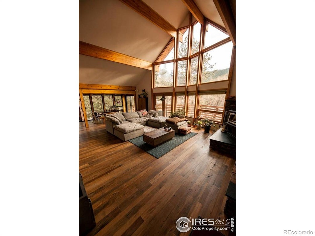 Tucked away just outside Boulder, this property blends artisan craftsmanship, modern luxury, and mountain serenity into one extraordinary home. With 500 feet of private creek frontage, almost six forested acres, and a creek-fed cold plunge, this reimagined cedar post-and-beam A-frame offers the soul of a wilderness getaway with the refinement of a designer estate.This home has been thoughtfully transformed and every detail tells a story of artistry and care. You are welcomed with reclaimed barnwood floors, custom tin ceilings, hand-plastered walls, locally forged metalwork, and a gas fireplace. Reclaimed Kentucky tobacco barn hardwood anchors the open living space. A chef-designed kitchen pairs hand-poured concrete counters and custom cabinetry with Wolf, Bosch, and Thermador appliances. East-facing floor-to-ceiling windows frame the creek below, while a Blaze King stove and whole-home ducted HVAC ensure year-round comfort.Retreat to two private suites, each with spa-like baths crafted from stone, Italian tile, and hand-troweled Tadelakt walls. The primary suite features a stone fireplace, custom built-ins, walk-in closet, and oversized soaking tub-offering the feel of a luxury retreat. The additional downstairs room easily flexes from guest space to office. Outdoor living is equally remarkable. Wraparound decks cantilevered over the creek invite connection and celebration with space to entertain, a gas fire lounge, cedar soaking tub, outdoor shower, and panoramic barrel sauna.Additional features include whole-home water filtration, Sonos sound, instant hot water, LED wildlife lighting, and privacy. More than a home, this property is a living masterpiece where mountain beauty and human craftsmanship meet. Whether envisioned as a year-round residence, a retreat for unforgettable gatherings, or a sanctuary to slow down and reconnect with nature, this rare property offers luxury without compromise.