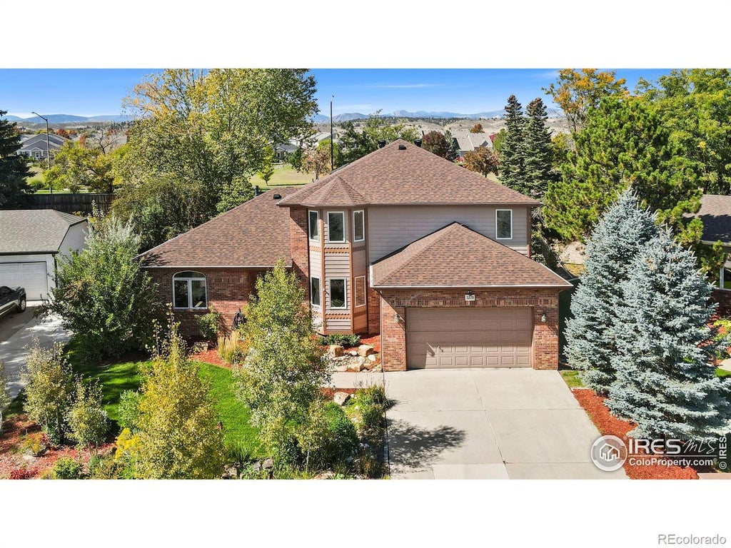 All-brick charmer on a cul-de-sac! This gorgeous home in the Fairway West neighborhood impresses with timeless curb appeal featuring a recently updated roof, and a professionally landscaped front yard that welcomes you as you arrive. The main floor was designed for entertaining, offering an open-concept layout with high ceilings, large windows that flood the space with natural light, and seamless flow between the living areas. The kitchen comes complete with stainless steel appliances, generous prep space, and abundant storage to keep everything organized and within reach. Choose a casual breakfast nook with a bay window overlooking the backyard, or enjoy the formal dining area with its own bay window facing the front. A spacious office with French doors adds flexibility to the space and can easily double as an additional bedroom. Upstairs, the home continues to impress with three generously-sized bedrooms, each featuring walk-in closets. The primary suite stands out with its vaulted ceilings, direct access to a private balcony with mountain views, and a luxurious 5-piece ensuite bathroom. Plus, a sunny, window-wrapped alcove is the perfect spot to relax with a good book or your morning coffee. The huge unfinished basement provides extensive space for expansion or additional storage, offering the potential to customize this area to suit your lifestyle needs. The fenced backyard is ready for gatherings with a raised deck and concrete patio. The large 3-car tandem garage offers ample space for vehicles, storage, or even a workshop. Located with convenient access to Loveland's numerous amenities and hotspots, this home is just minutes away from downtown, The Olde Course, and Lake Loveland, providing easy access to recreational activities, shopping, and dining. No HOA or Metro District!