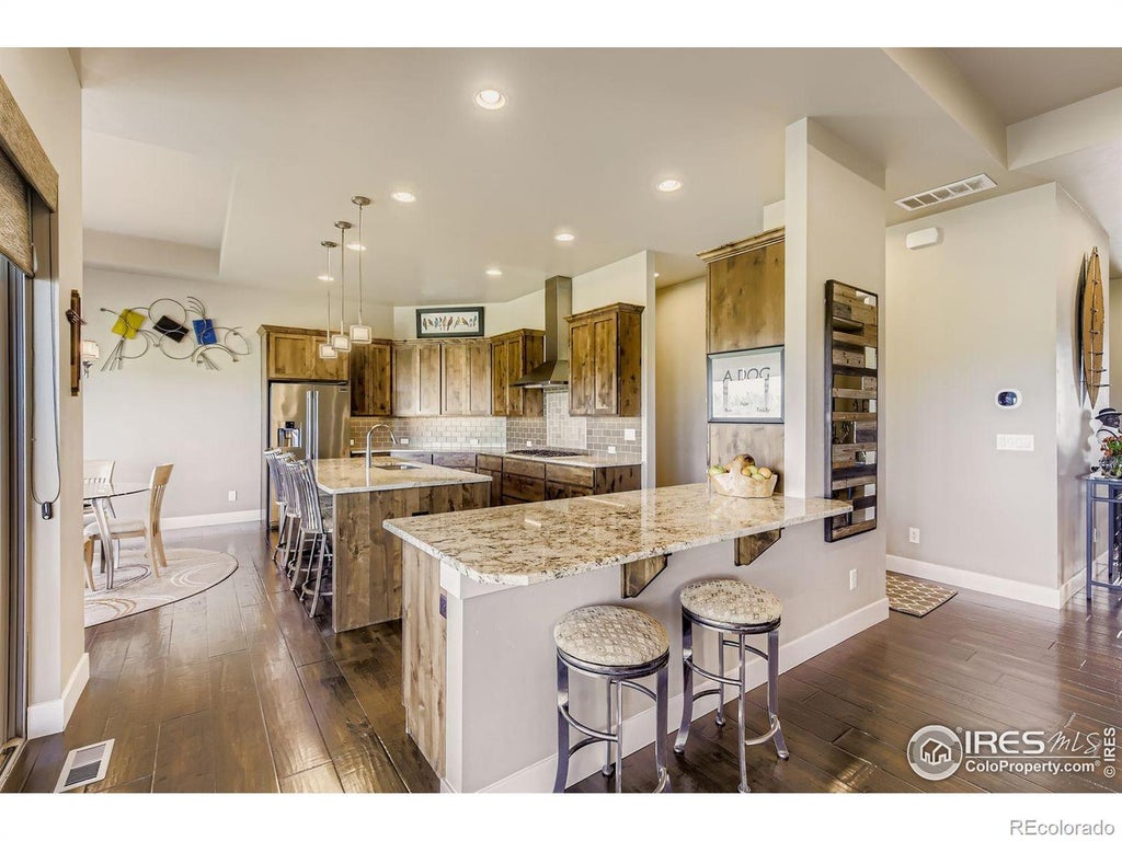 Fantastic location! Spacious ranch style home on open space with gorgeous mountain views to the back. No one behind you! All this with roomy bedrooms with ensuite baths finished walk out lower level with an entertainment center like no other! Great place for gatherings with family and friends, possible mother-in-law suite. Entertainment center has refrigerator, dishwasher, microwave and sink! Main level has gourmet kitchen, over-sized primary suite with luxury bath, all with incredible views! Huge covered deck to enjoy the Colorado seasons, room for dining table and seating area. All professionally landscaped and meticulously maintained. See list of special features, too long to list here! This is a must see!
