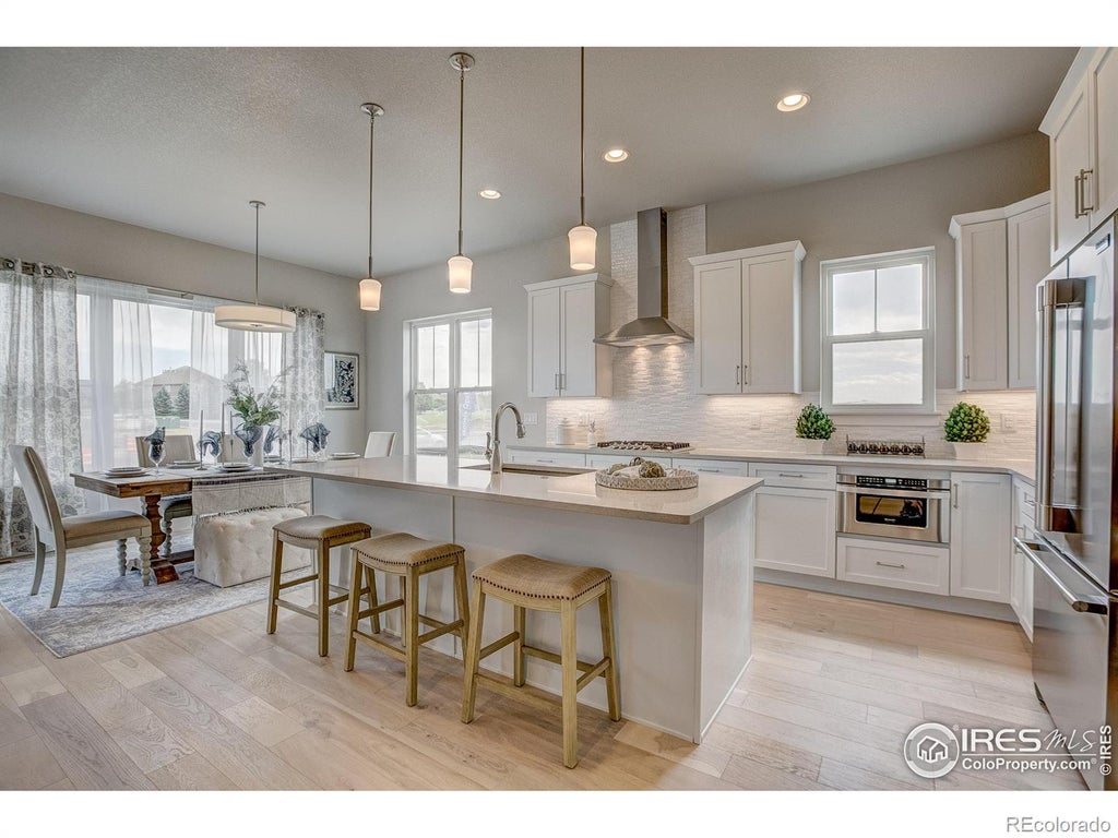 Welocme home to the former Landmark Homes model! This move-in ready stunning ranch style home has a fully finished basement w/ wet bar, & centrally located in Windsor. This home is adjacent to a pocket park & will have a future pocket park beside for ultimate privacy. Be the first homeowner to enjoy this gorgeous new home featuring Smart Home Technology, energy efficient tankless water heater & furnace, A/C, 10' ceilings, upgraded gourmet kitchen w/ stainless appliances including refrigerator, quartz counters, extended engineered hardwood throughout living space & primary bedroom, study w/ glass French doors, 8' solid doors, full landscaping, trails, mature tree lined exterior, & close to shopping, dining, medical & I-25. Schedule your private tour today! Model located at 8412 Cromwell Circle, Windsor, CO 80528.